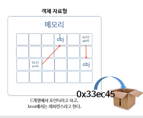 객체 자료형은 객체 메모리 주소가 변수에 저장됨 => 실제 객체는 다른데 존재하고, 객체를 가진 주소를 가지고 있음.