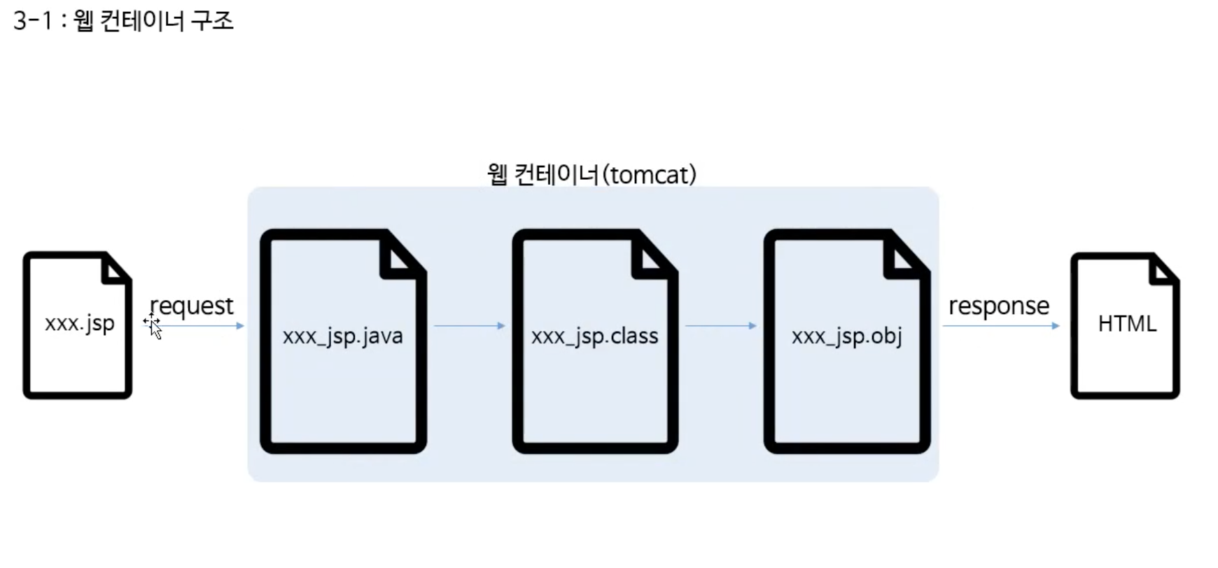 1. 개발자가 xxx.jsp페이지를 만들면 request를 통해 웹컨테이너(톰캣)를 거쳐서 사용자에게 response응답 될 때는 HTML로 응답이 되어짐