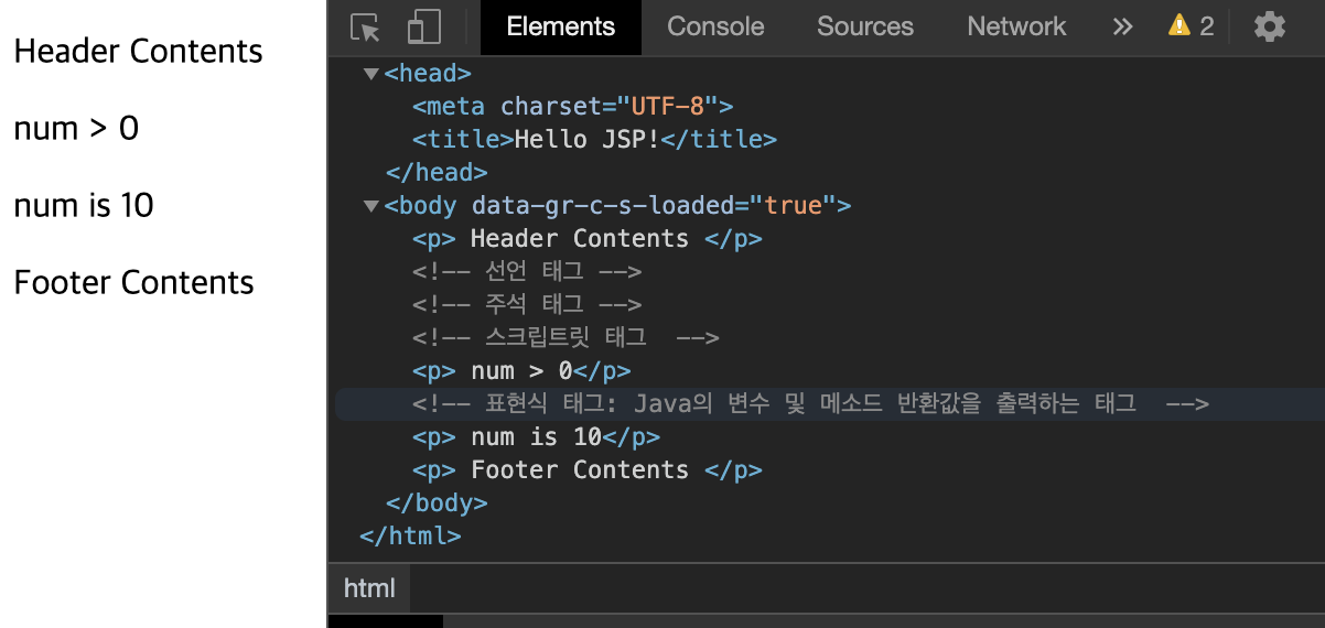 <!-- 표현식 태그: Java의 변수 및 메소드 반환값을 출력하는 태그 -->