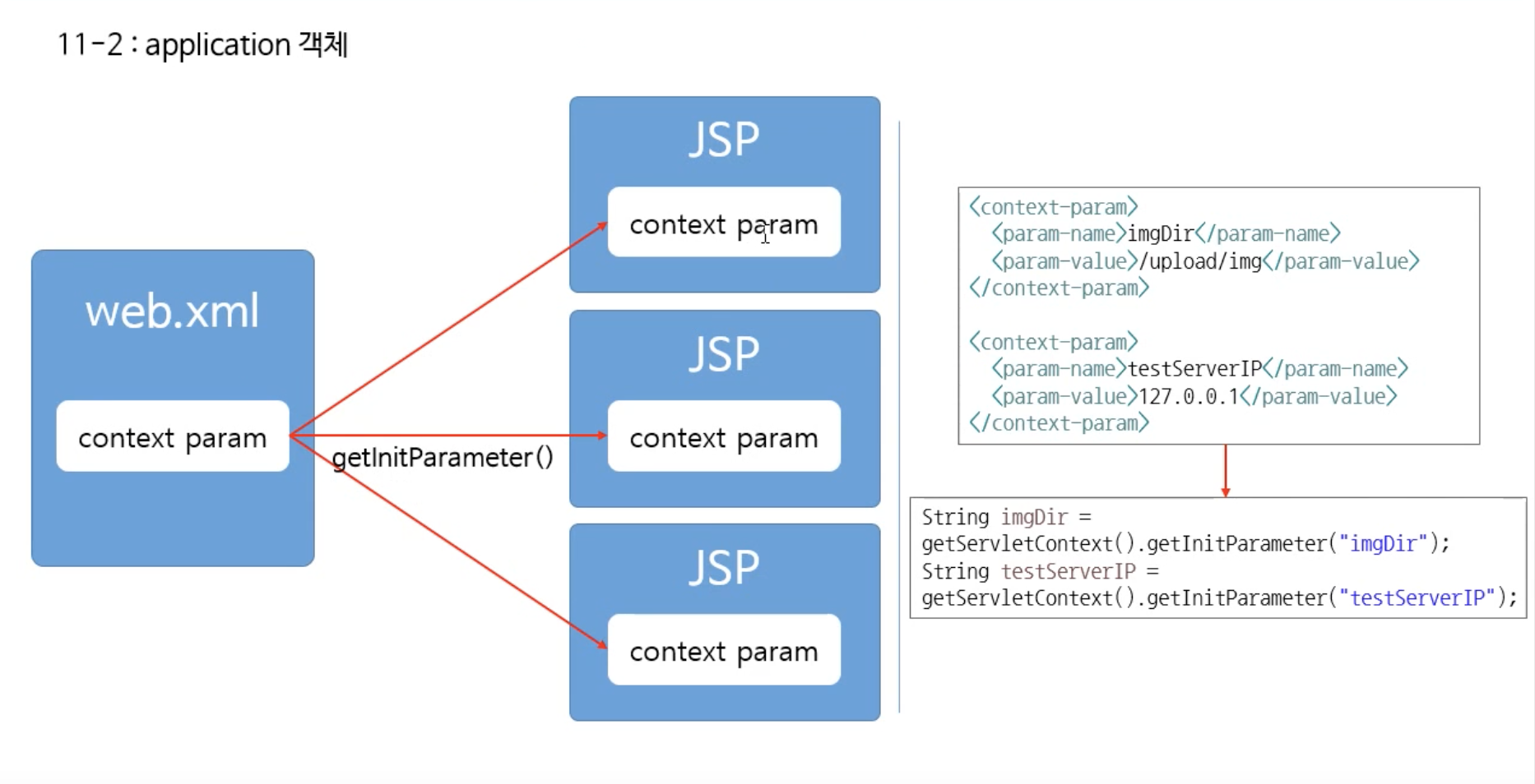 web.xml 파일 수정을 통해 JSP 파일과 Servlet 에서 데이터 공유가 가능합니다. 다수의 서버 IP 주소, 파일 시스템 조작을 위한 경로 지정과 같은 상황들이 있을 수 있겠죠. 이것은 고유의 내장객체이��
