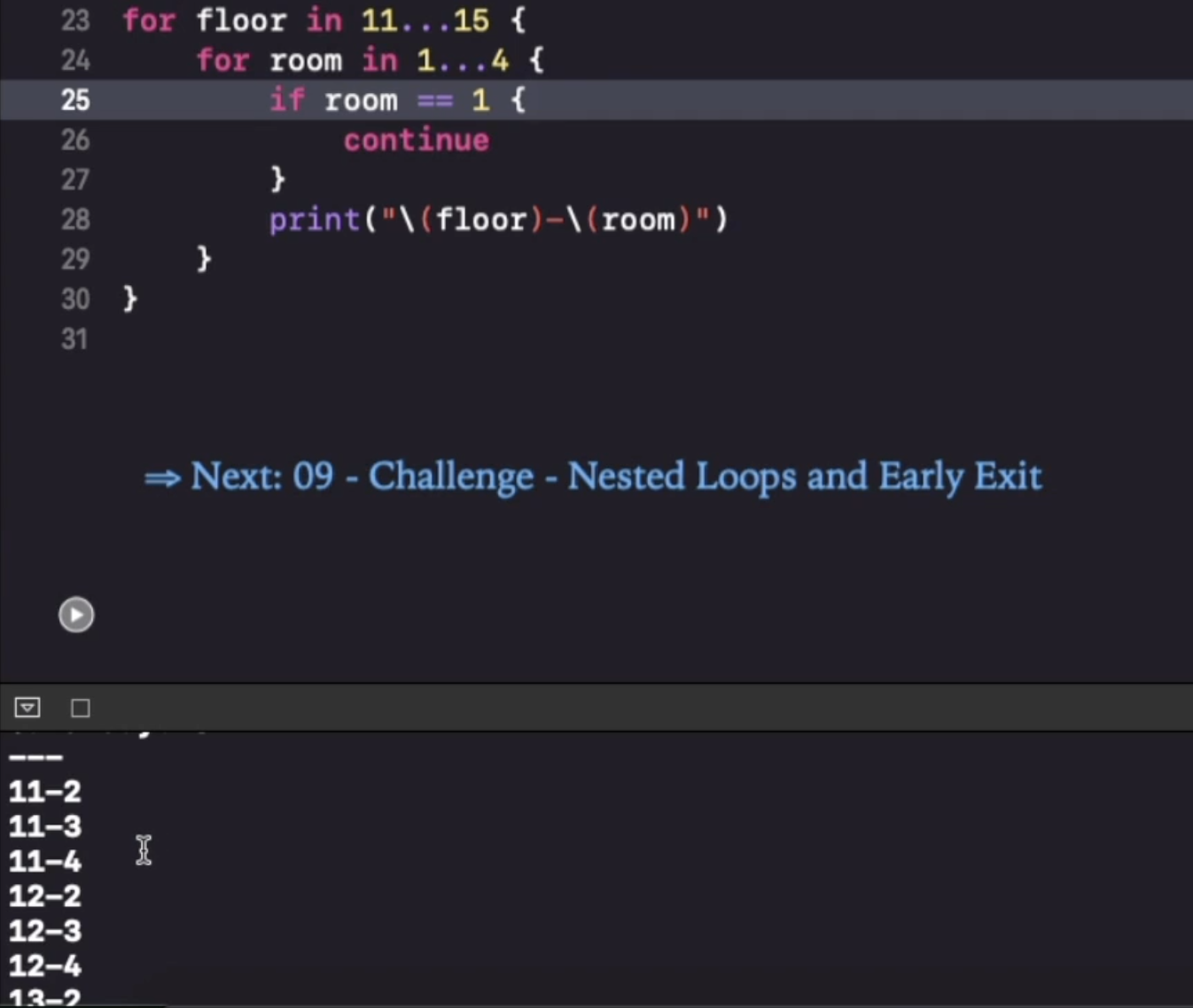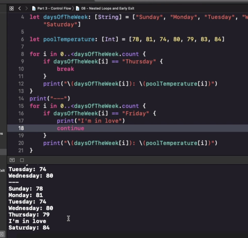 Friday Element를 만나면 "I'm in love"를 프린트 하고, continue statement가 -> 야 스위프트야 그 코드는 그만하고 다음 iteration 돌아라