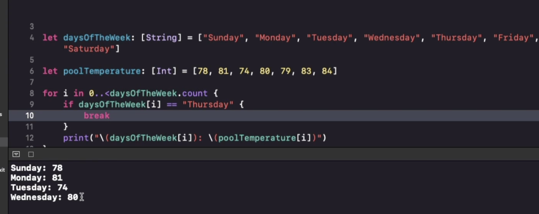 print("\(daysOfTheWeeks[i]: \(poolTemperature))")