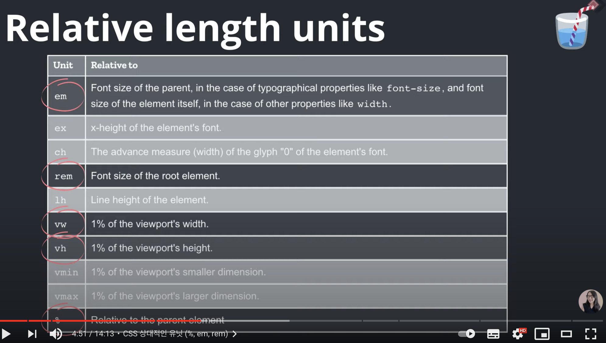 - 자주 사용하는 em, rem, vw, vh, % 정도 알고있으면 좋음.