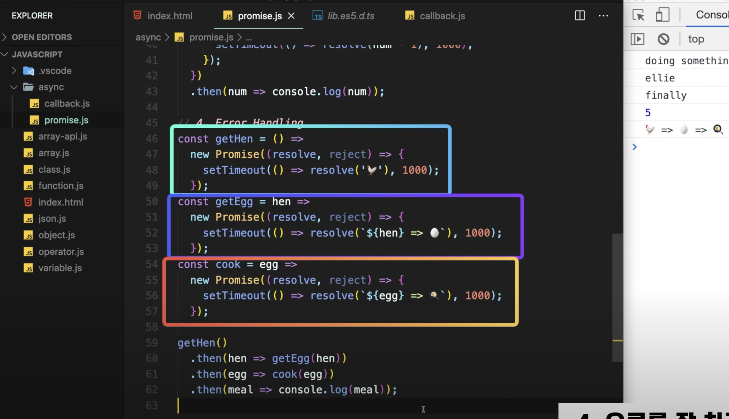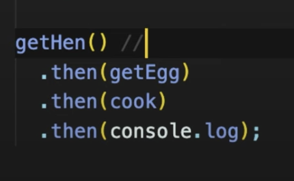 그 리턴된 egg를 cook(egg)로 매개변수로 넣어주고 완료시 🐓 => 🥚 => 🍳 이 리턴됨.