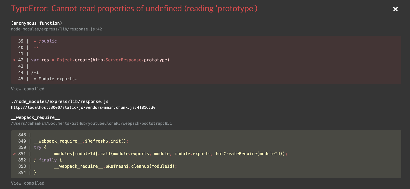 node_modules를 모두 지우고 npm install로 디펜던시를 재설치 한 후에야 로컬서버를 다시 띄워보아도 똑같은 에러가 떴다. 스택오버 플로우에 찾아보니, 클라이언트와 서버를 구분안하고 작성해서 그렇다는 말도 있고, 여러가지 솔루션이 있어 시도해보았지만 안된다. 우선 해결해보고, 업뎃할 예정(10/14 22:20)