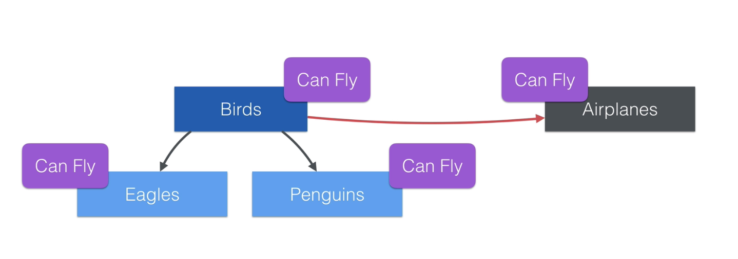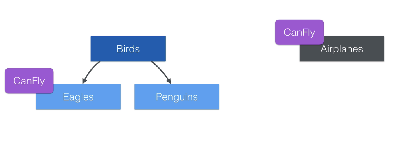 아래처럼 AirPlane이 Bird가 가진 CanFly를 상속받고 싶어도, 알을 품는다던지 그런 function은 만족하지 않기 때문에 상속받을 수가 없다. 게다가 펭귄은 날수도 없는데 Bird라는 이유만으로 불필요한 function까지 상속받고 있다.