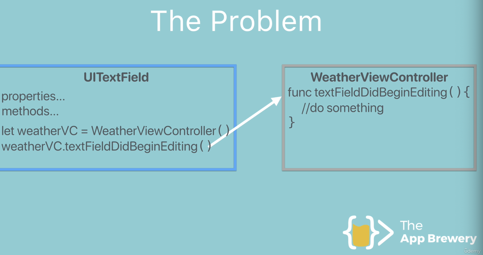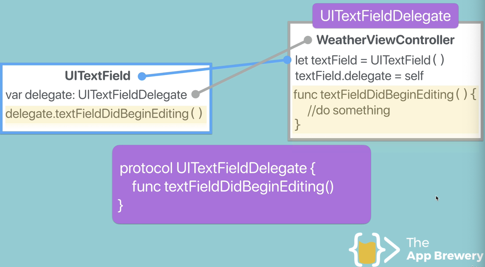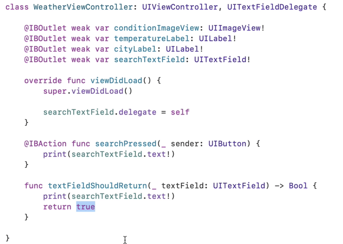 - 그 변수에다가 delegate을 해줬음, 현재 view를 이런식으로. textField.delegate = self ==> 하는 순간 UITextFieldDelegate라는 UITextField내부에 있는 delegate변수가 곧 뷰컨이 되어버림 ex)WeatherViewController
