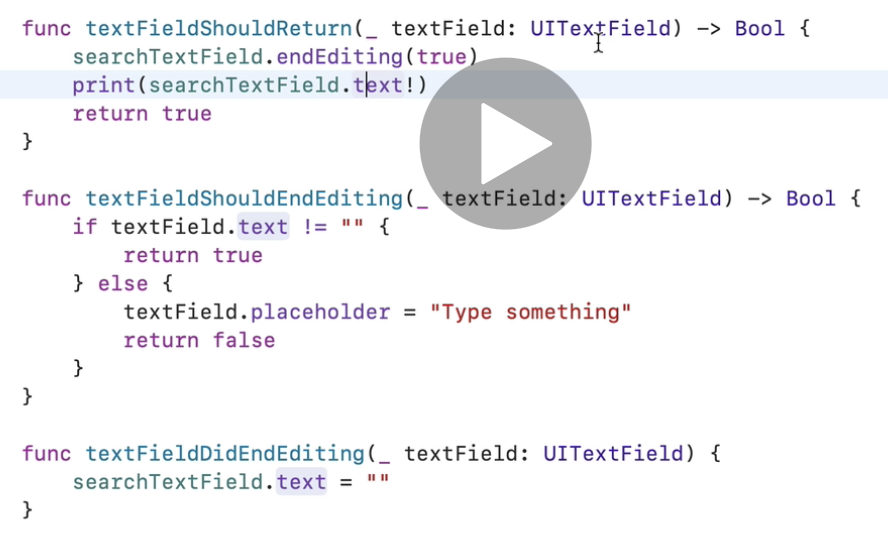 - if textField.text != "" // 만약에 유저가 아무것도 타이핑안했으면 return true => should end edting 해라! 라고 하는게 return true 이고 textFieldShouldEndEdting에서 트루를 반환하면 textFieldDidEndEdting function이 trigger됨