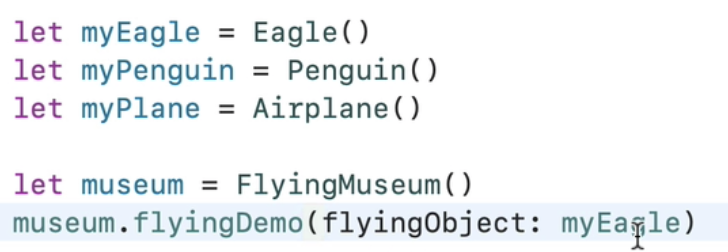 - 그래서 아래처럼 flyingObject의 파라미터 타입을 CanFly 프로토콜로 설정할 수 있다!
