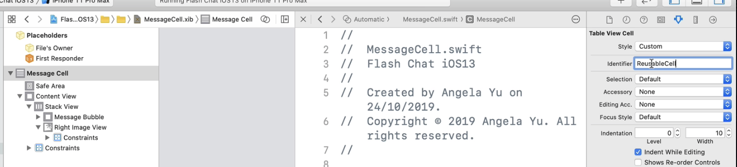 - cellIdentifier => MessageCell.xib에 Message Cell 을 선택하고 Table Vie Cell 우측 인스펙터에서 Identifier: ResuableCell로 설정, ResuableCell명은 struct K의 cellIdentifier로 설정한 이름으로 설정한 것임