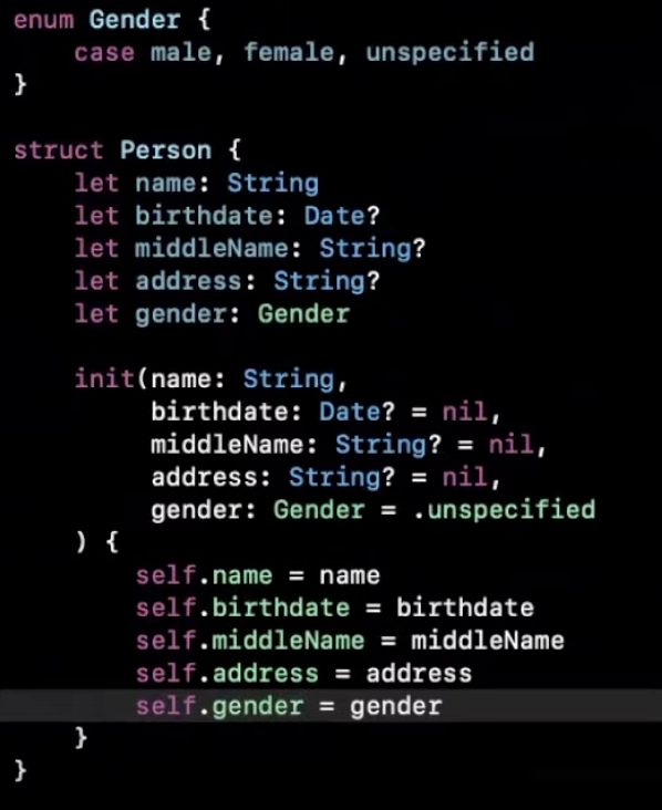 birthdate: Date?, middleName: String?, address: String?, gender: Gender등