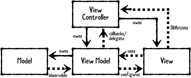 모델이 있으면, 그 모델을 가져와서 모델의 데이터를 변경하고 계산하는 로직은 ViewModel에 넣고, ViewController에서는 ViewModel을 가져와서 사용. ViewController에서는 계산된 것 데이터 UI 에 뿌려주기만 한다.