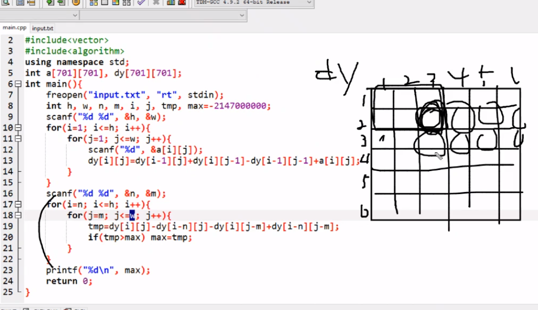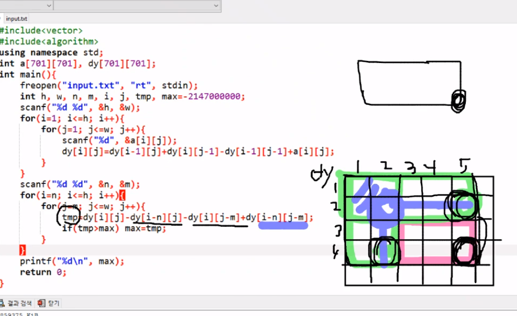 sum = dy[i][j] - dy[i - n][j] - dy[i][j - m] + dy[i - n][j - m];