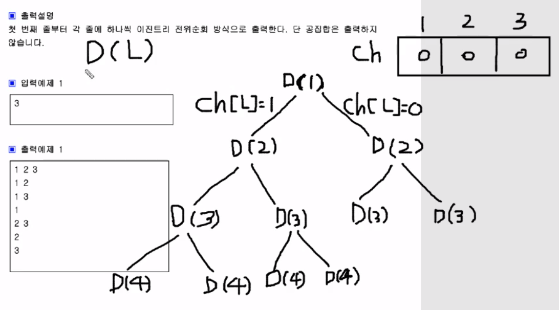 - if(L == n+1) 종료지점, 여기서 ch배열을 찍어준다. 1 2 3