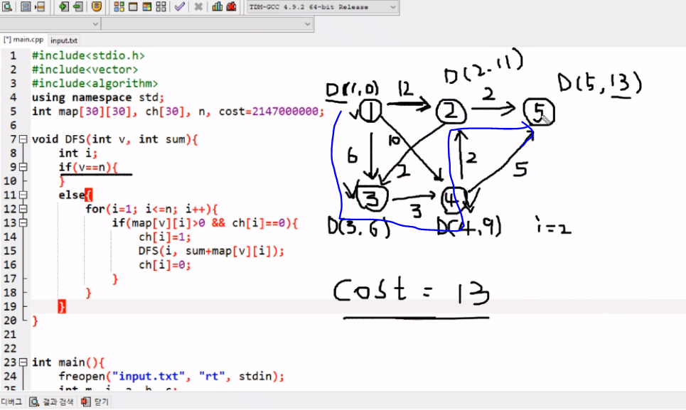 // 67번 - 최소비용 DFS 인접행렬 (가중치 방향그래프)