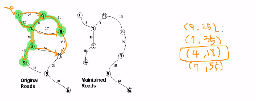 그 다음 우선순위 큐에서 18이 제일 수가 적어서 4번 노드를 추가 한다.